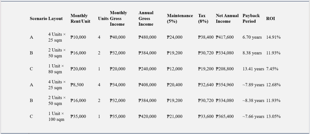 These calculations reveal that smaller units generally offer faster ROI due to higher per sqm income. However, the single large unit model can also be favorable in high-rent areas with lower vacancy risk.